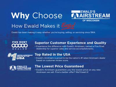 Ewald’s Airstream of Wisconsin is not responsible for any misprints, typos, or errors found in our website pages. Any price listed excludes sales tax, registration tags, and delivery fees. Manufacturer pictures, specifications, and features may be used in place of actual units on our lot. Please contact us @414-376-8438 for availability as our inventory changes rapidly. All calculated payments are an estimate only and do not constitute a commitment that financing or a specific interest rate or term is available.